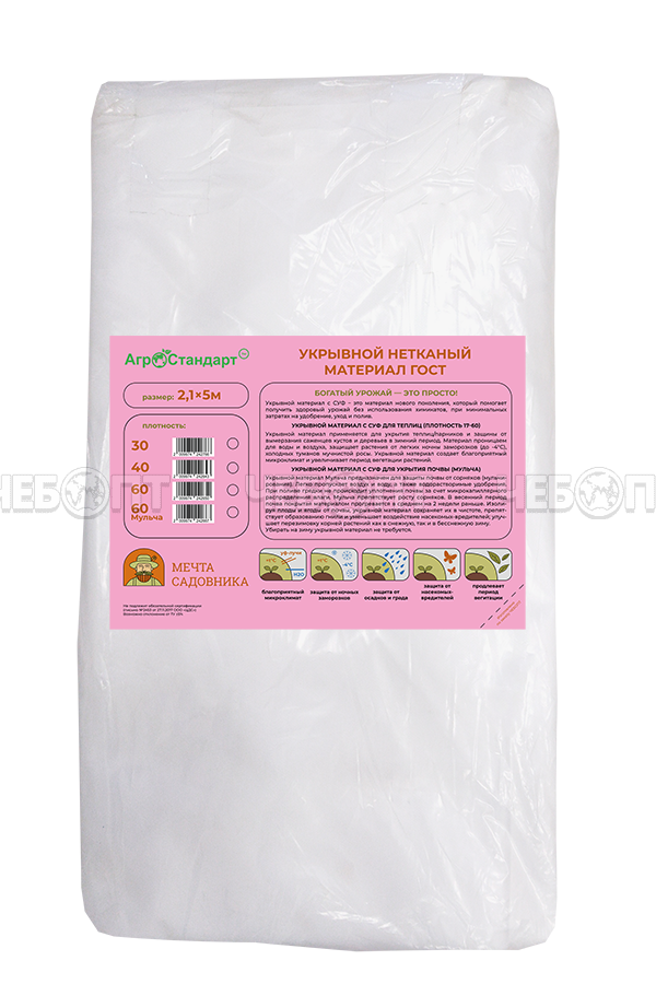 Торгово-производственная компания ЧЕБОПТ продает 5М Укрывной материал (спанбонд) АгроСтандарт плот. 40 (ширина 2,1 м, длина 5 м) с СУФ ГОСТ [5] МПС СобПр. Информация по приобретению товара - 8-800-200-84-11.