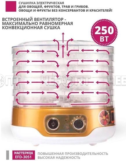 Торгово-производственная компания ЧЕБОПТ продает Электросушилка МАСТЕРИЦА EFD-3051 для овощей 5 поддонов +1 поддон для пастилы, возможность регулировки темп. внутри мощн 250 Вт [1]. Информация по приобретению товара - 8-800-200-84-11.