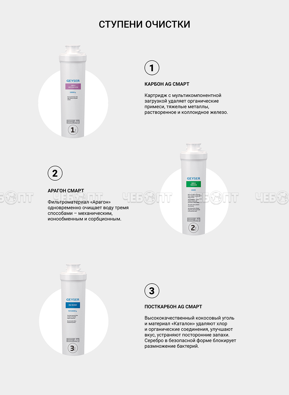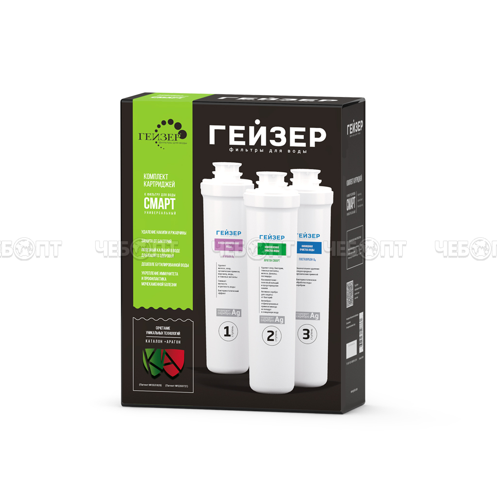 Торгово-производственная компания ЧЕБОПТ продает Комплект сменных картриджей фильтрующих ГЕЙЗЕР СМАРТ 3 картриджа: умягчитель, арагон смарт, посткарбон, для жесткой воды арт. 50095 [3] . Информация по приобретению товара - 8-800-200-84-11.