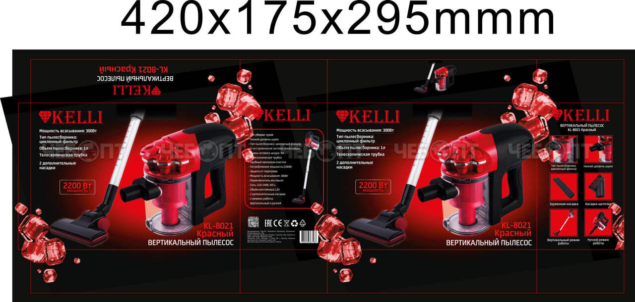 Торгово-производственная компания ЧЕБОПТ продает Пылесос вертикальный KELLI KL-8021 КРАСНЫЙ сухая уборка, цикольный фильтр, мощность всасыв.300 Вт, телескоп. трубка, мощность 2200 Вт [4]. Информация по приобретению товара - 8-800-200-84-11.