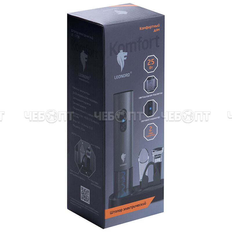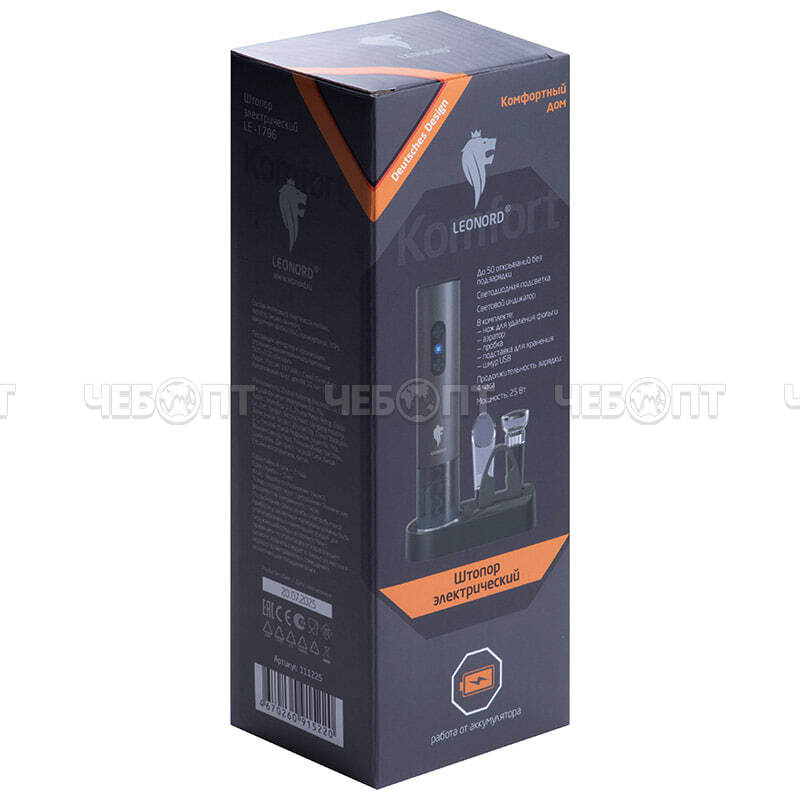 Торгово-производственная компания ЧЕБОПТ продает Штопор электрический LEONORD LE-1796, металл, пластик, USB шнур, нож для удаления фольги, аэратор, пробка для бутылки арт. 111225 [25] СКРАП. Информация по приобретению товара - 8-800-200-84-11.
