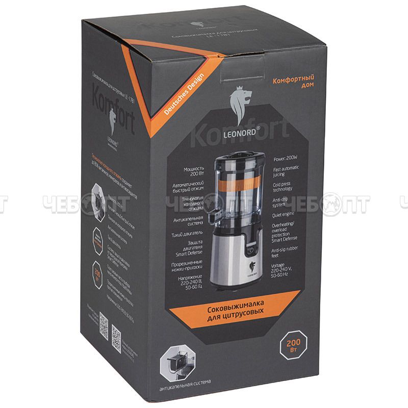 Торгово-производственная компания ЧЕБОПТ продает Соковыжималка электрическая для цитрусовых LEONORD LE-1781 авт.быстрый отжим,техно.холод.отжима,антикап.сис.тихий двигатель, арт. 109287 [12] СКРАП. Информация по приобретению товара - 8-800-200-84-11.